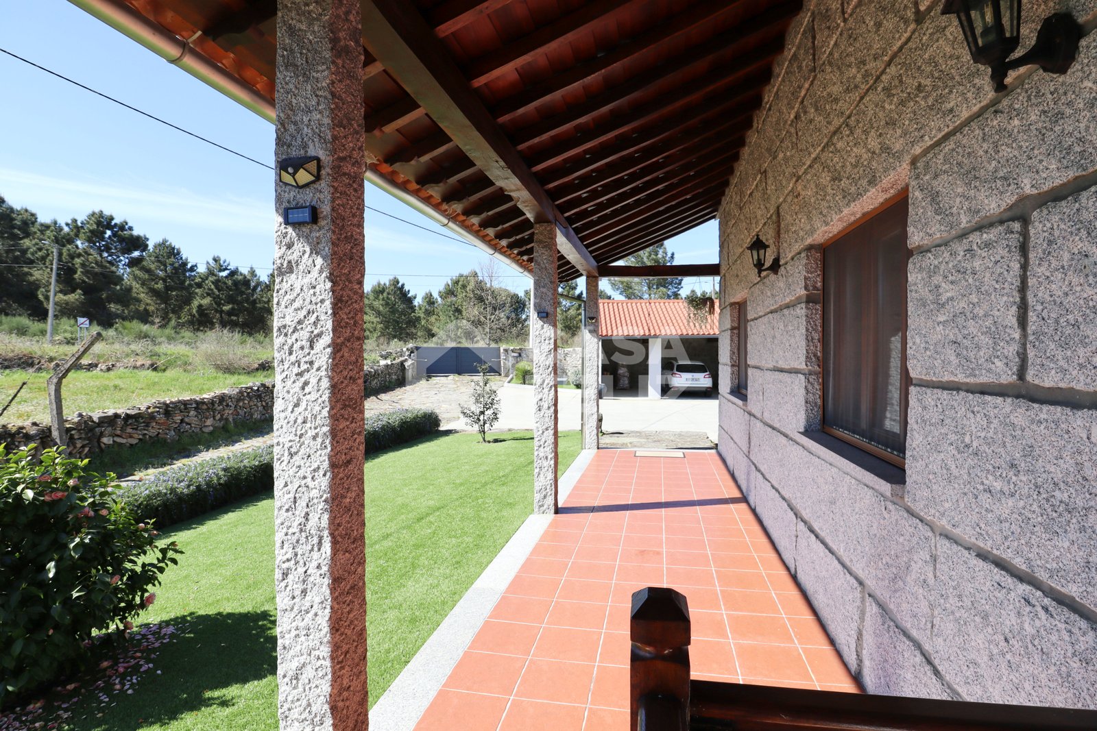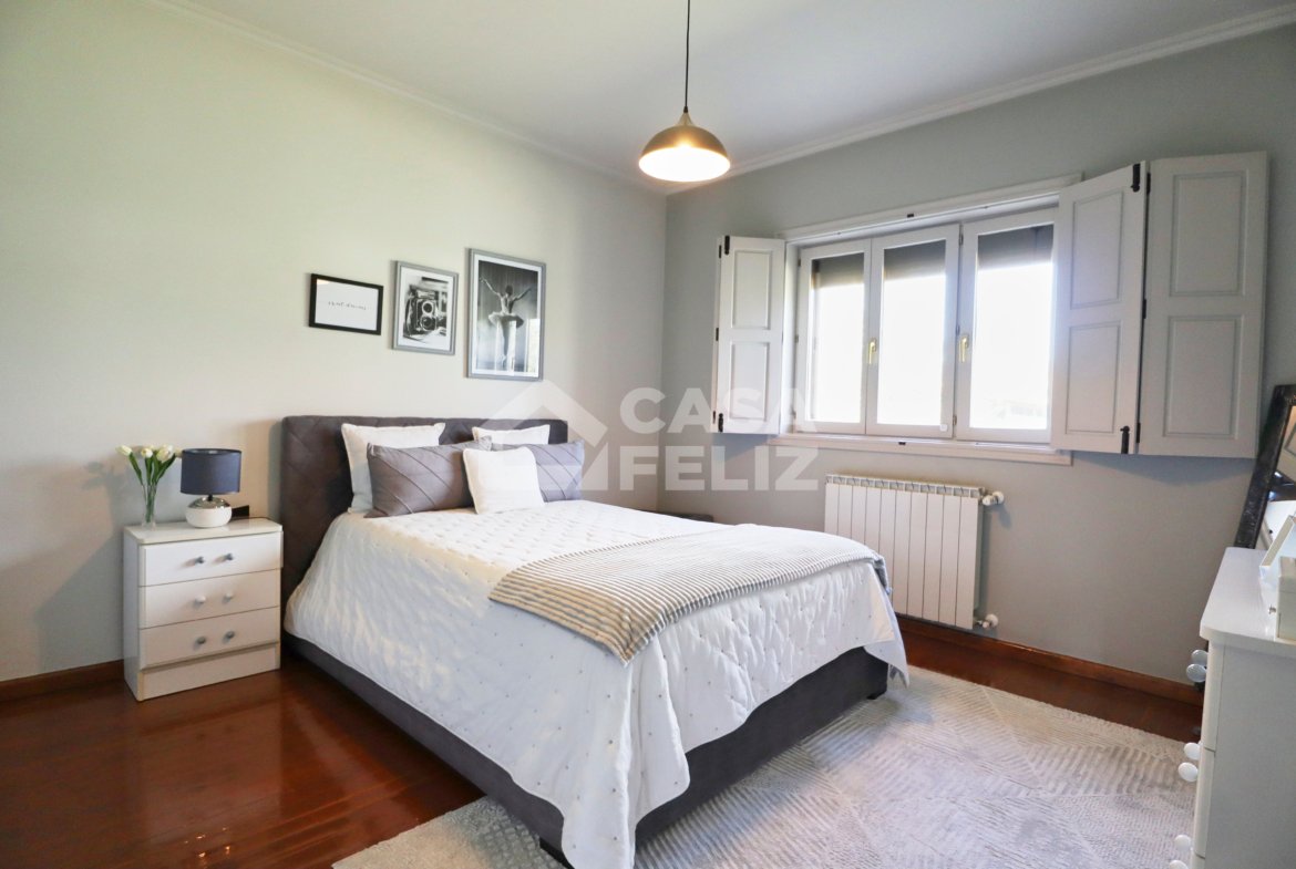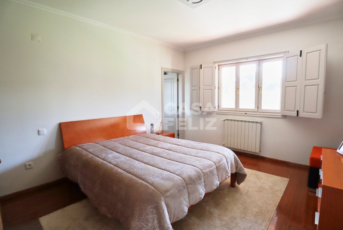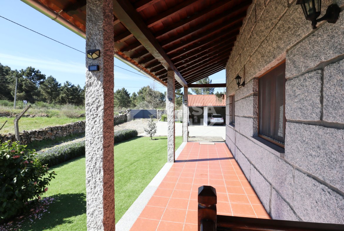 Já o espaço exterior é um verdadeiro convite ao lazer, possuindo piscina, jardim, alpendre em madeira, fachada em pedra conferindo charme e durabilidade e ainda garagem e arrumos.