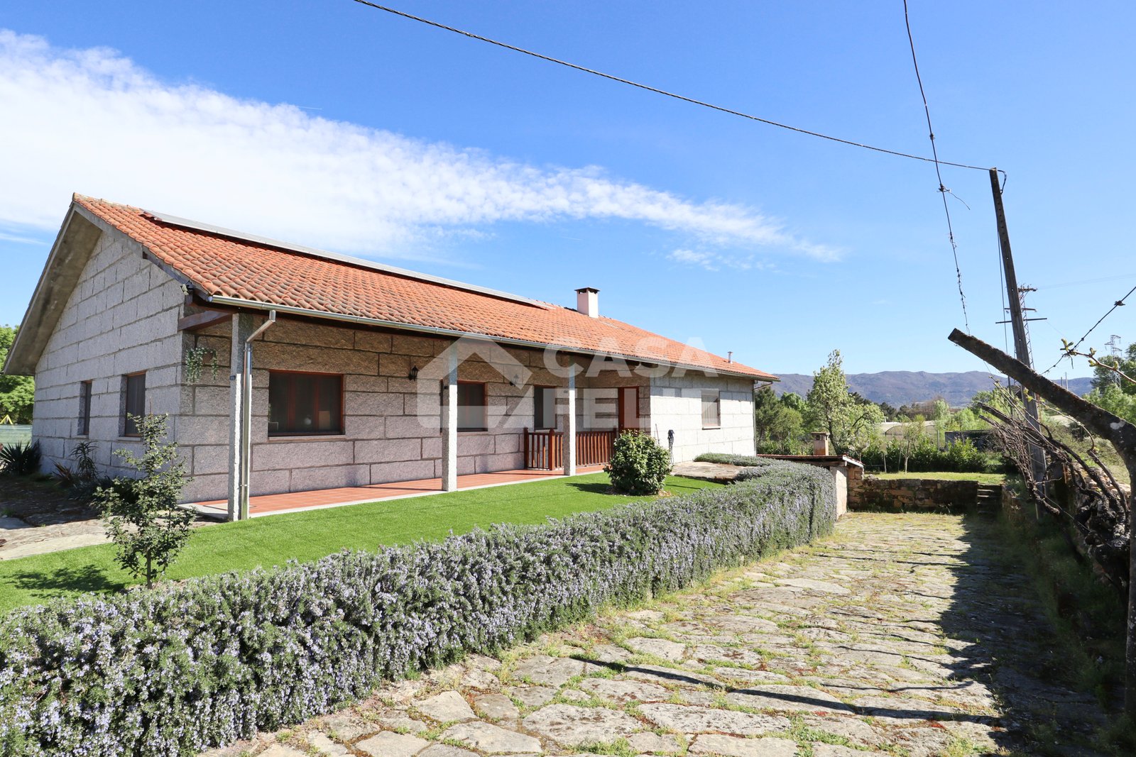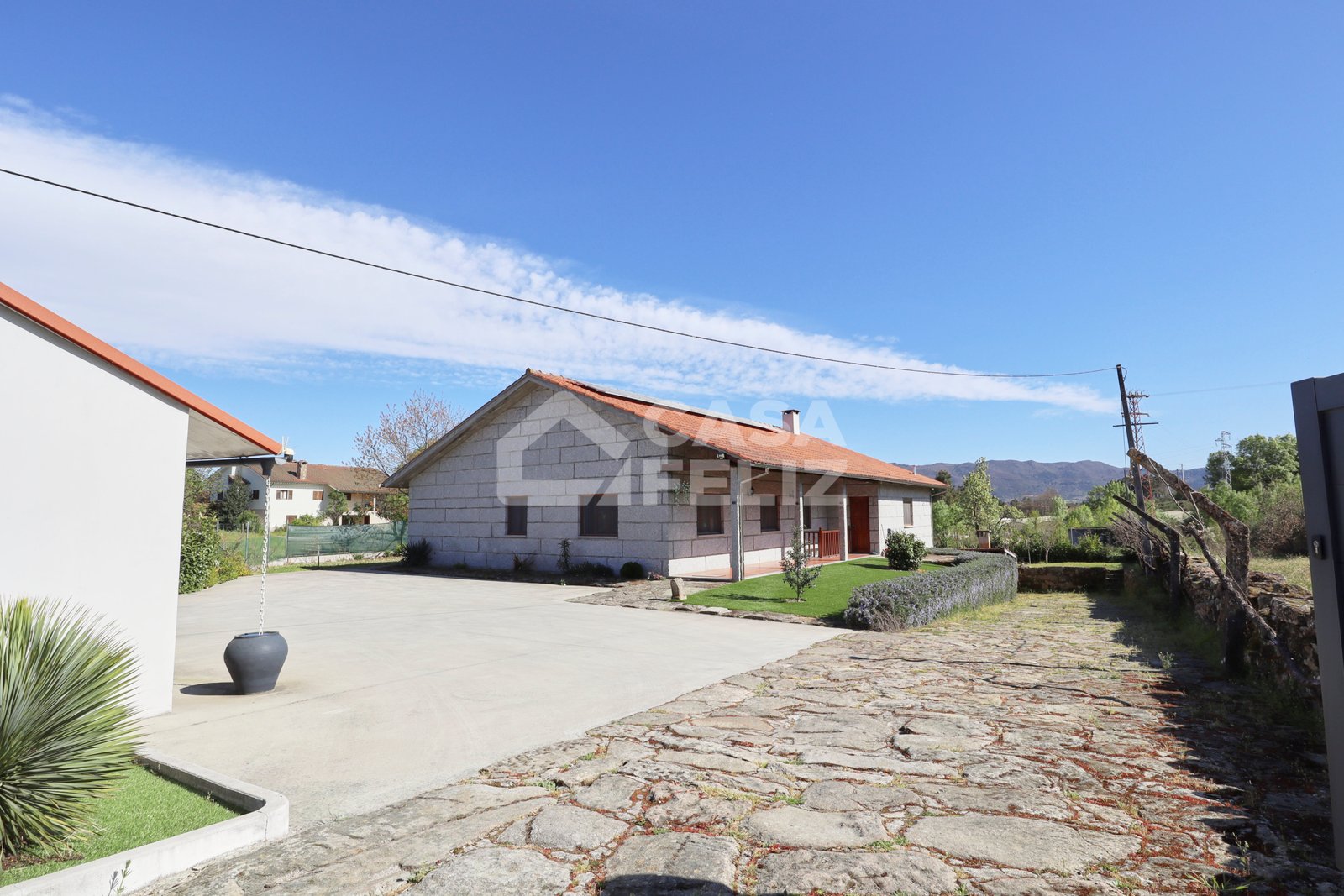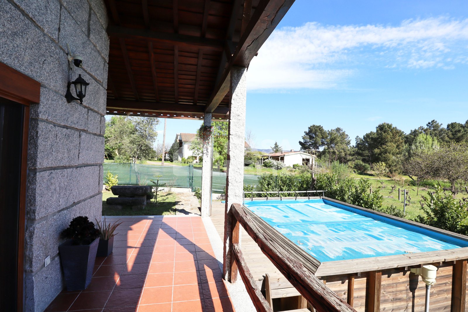 Já o espaço exterior é um verdadeiro convite ao lazer, possuindo piscina, jardim, alpendre em madeira, fachada em pedra conferindo charme e durabilidade e ainda garagem e arrumos.