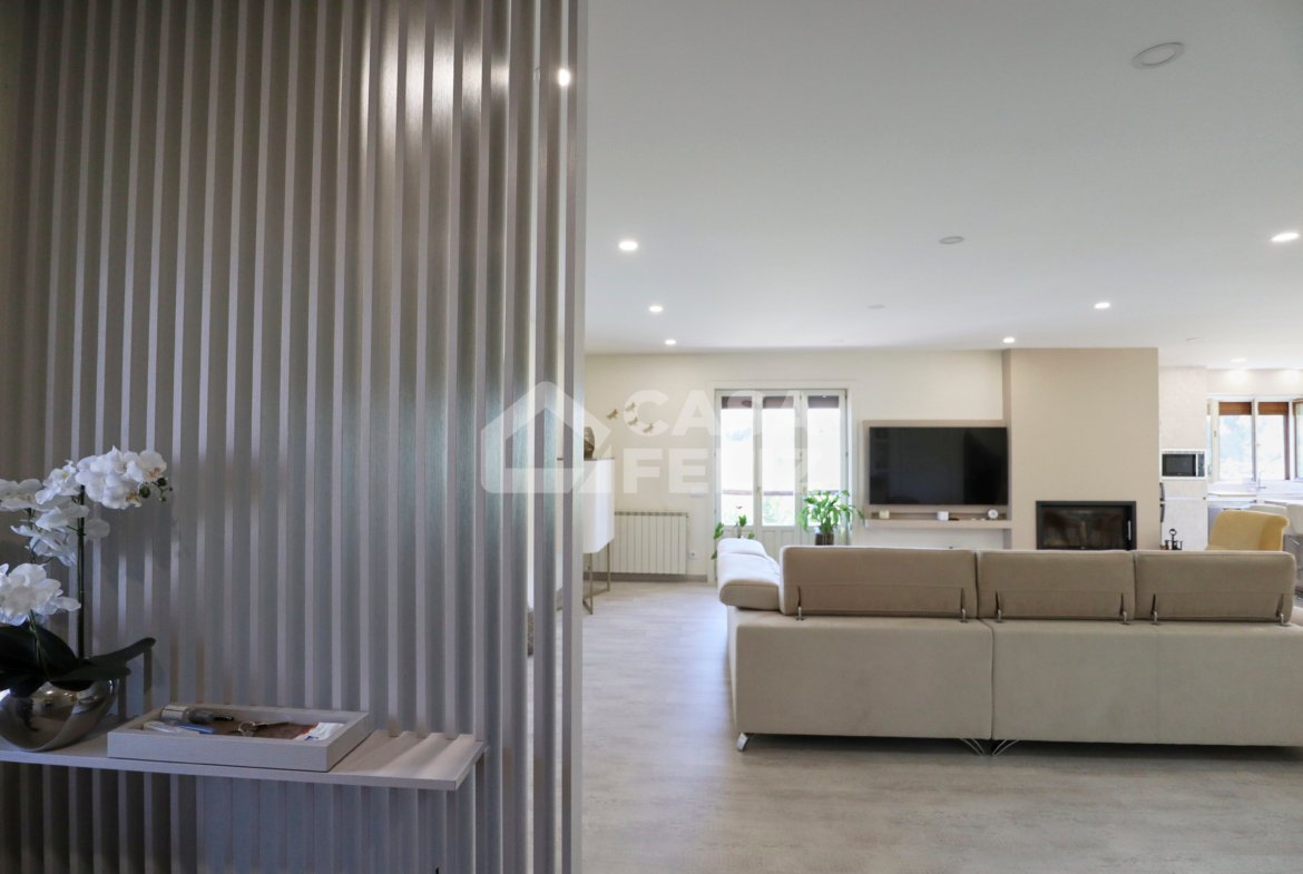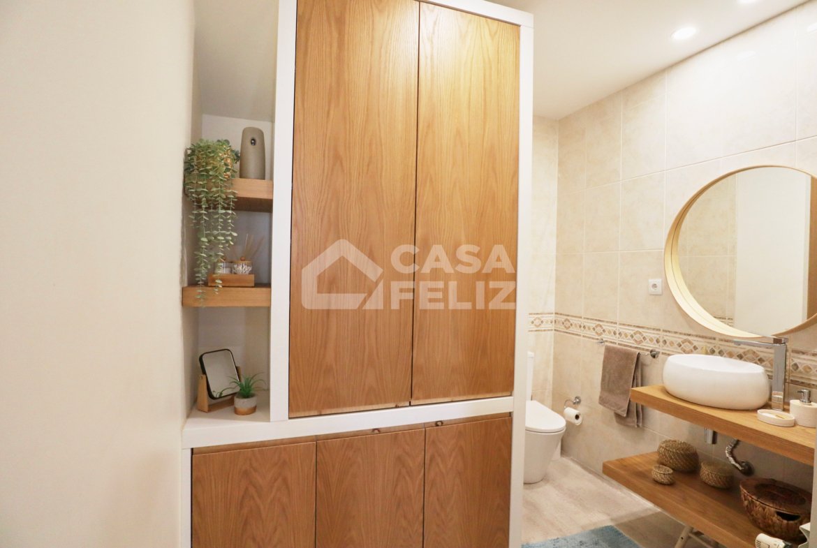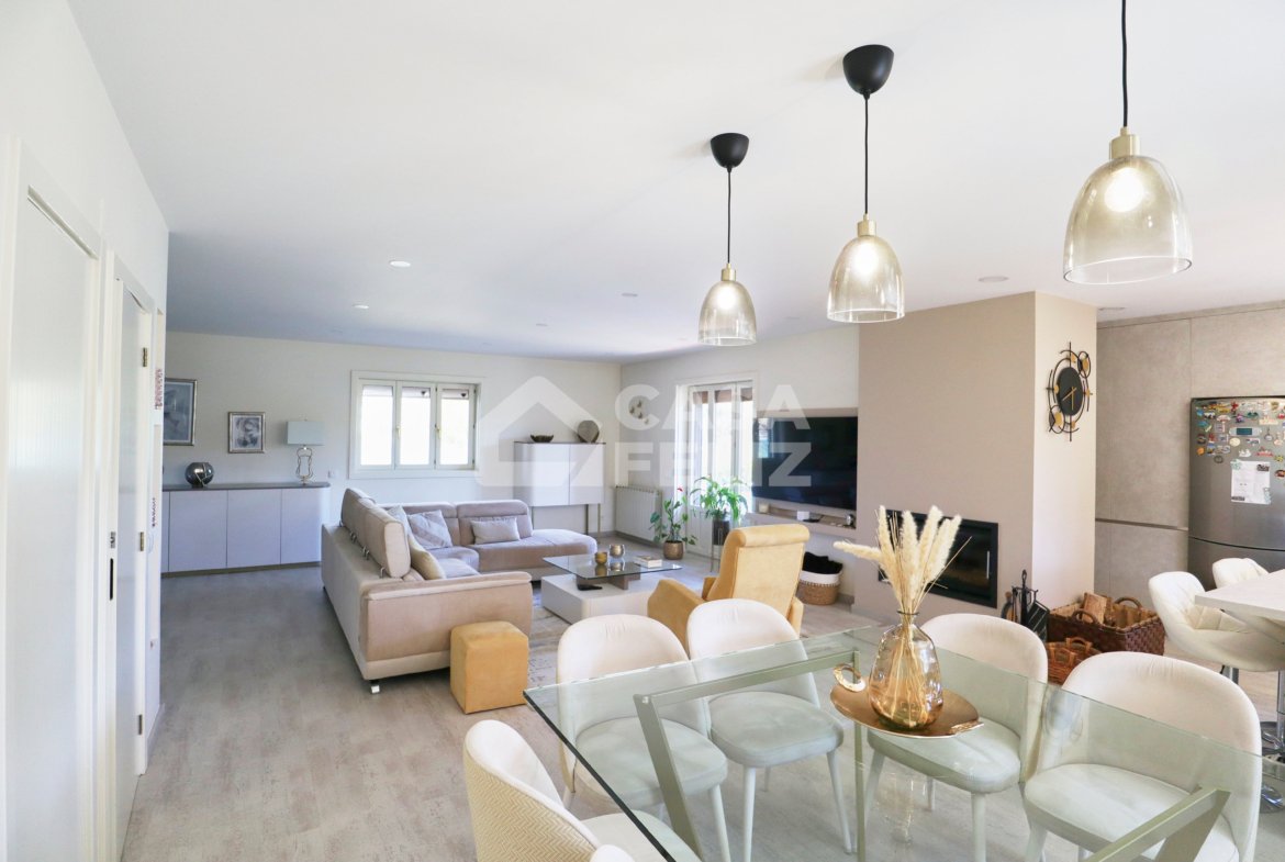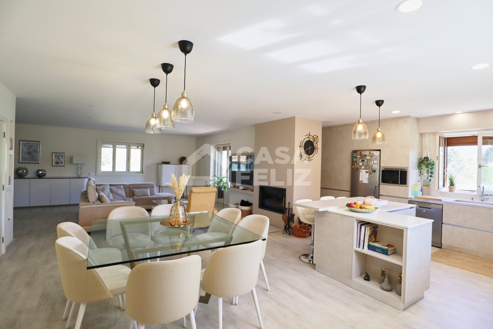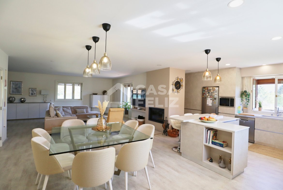 Ao entrar, encontra uma ampla sala em open-space, onde luz natural e decoração contemporânea encaixam na perfeição. A sala de estar comunica harmoniosamente com a zona de refeições e com uma cozinha totalmente equipada, moderna e prática, oferecendo o ambiente ideal para convívio.