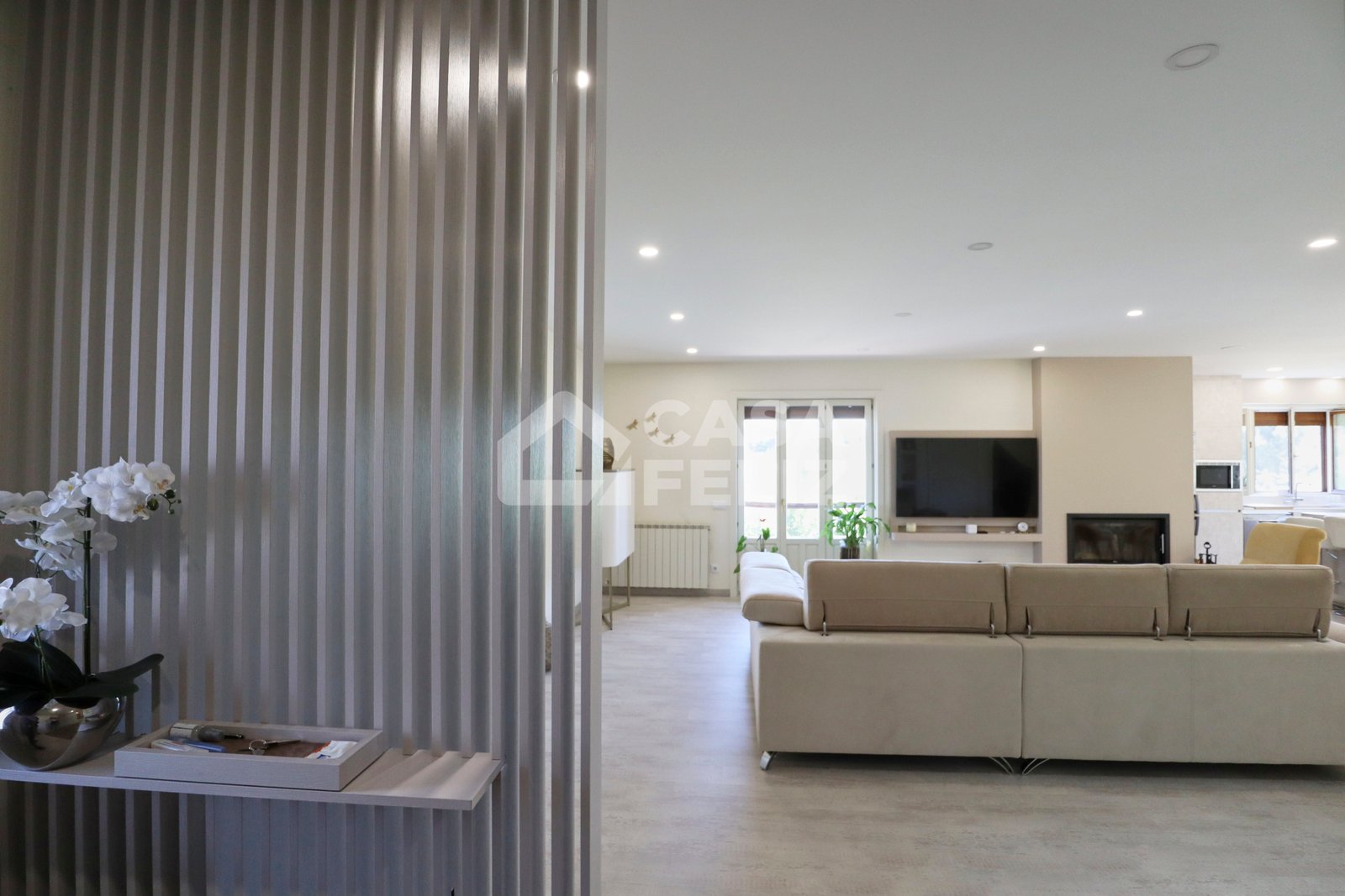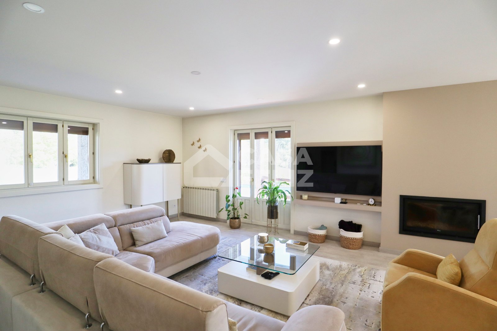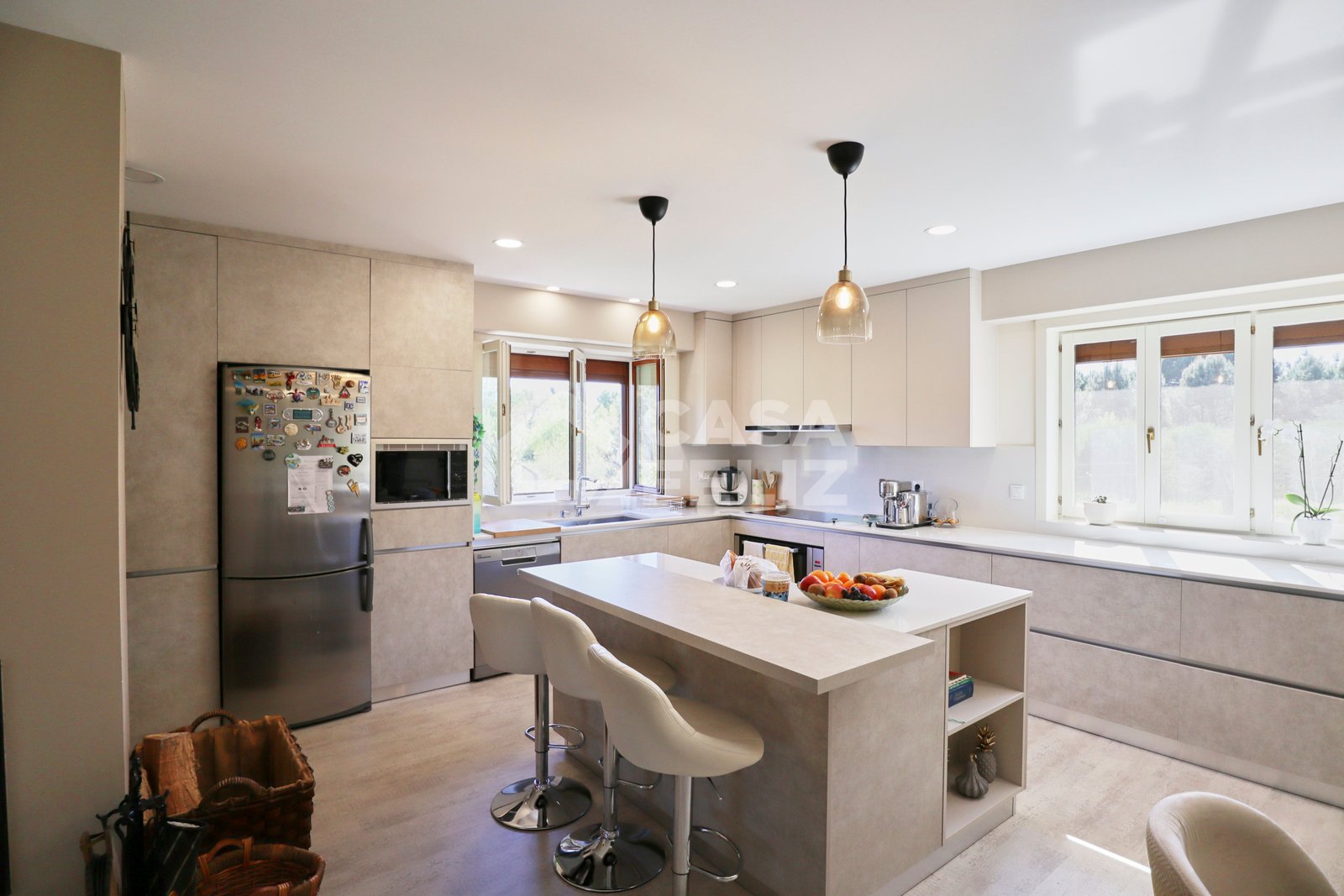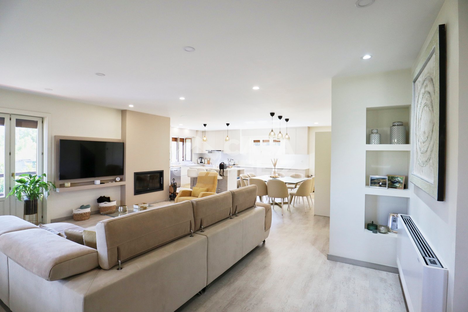 Ao entrar, encontra uma ampla sala em open-space, onde luz natural e decoração contemporânea encaixam na perfeição. A sala de estar comunica harmoniosamente com a zona de refeições e com uma cozinha totalmente equipada, moderna e prática, oferecendo o ambiente ideal para convívio.